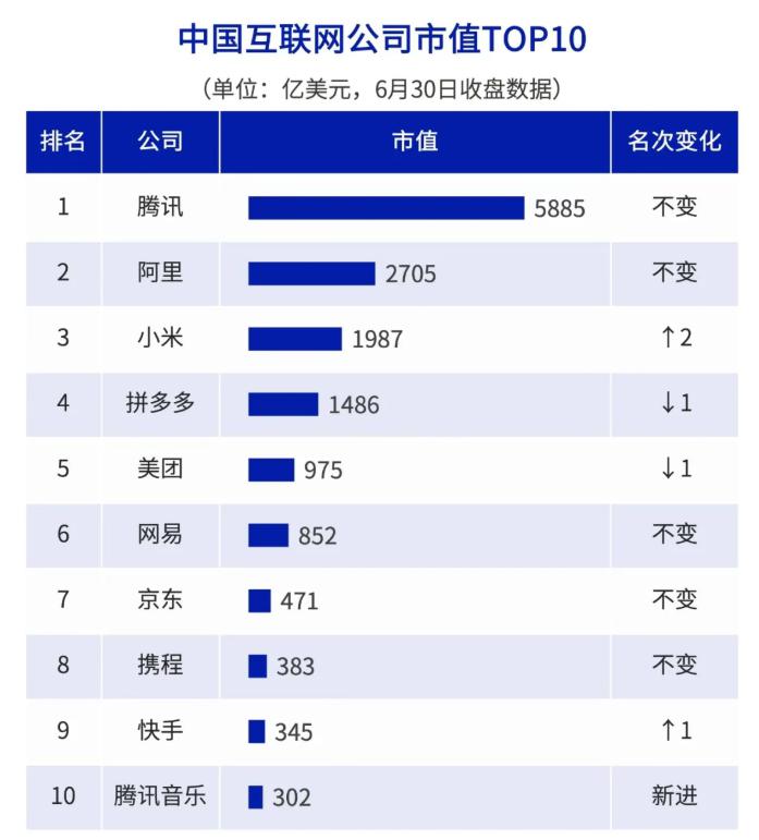 今年 6 月 30 日的收盘数据,以市值为维度,中国互联网企业腾讯排名第一,阿里第二,小米杀到第三名,百度被挤出前十。