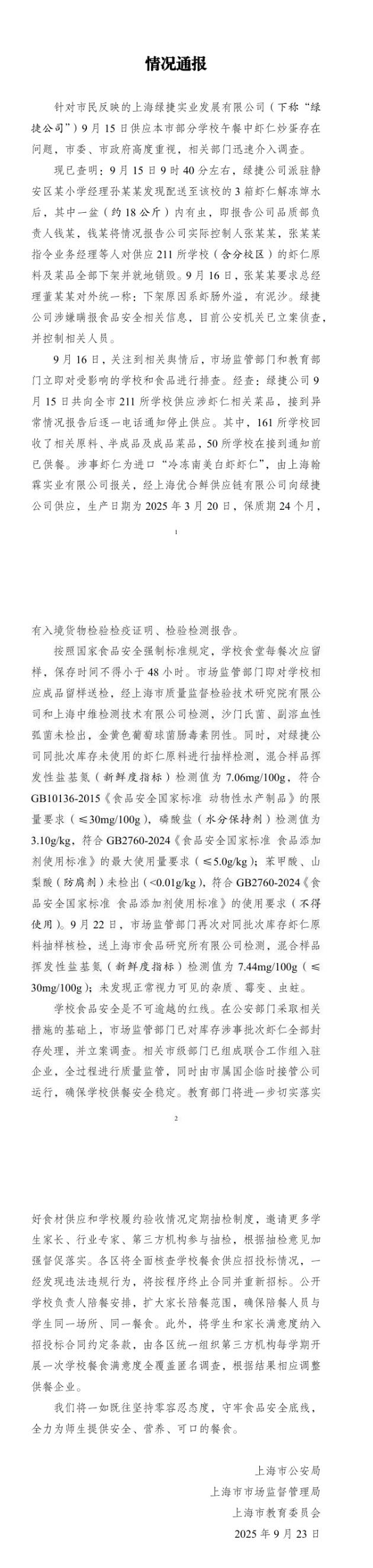 9月23日,记者获悉,针对市民反映的上海绿捷实业发展有限公司(下称“绿捷公司”)9月15日供应上海市部分学校午餐中虾仁炒蛋存在问题,相关部门介入调查,上海市公安局、上海市市场监督管理局、上海市教育委员会发布情况通报,详情如下:
