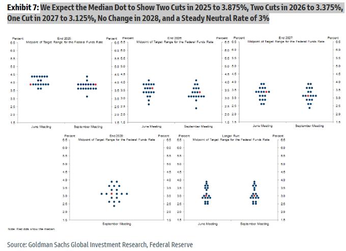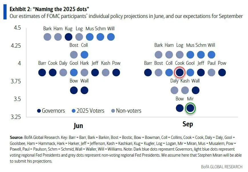 从业内人士的普遍分析来看,本次美联储点阵图的看点主要有三方面:首先最受瞩目的就是 2025 年的降息路径——若今晚降息 25 个基点,美联储在年内余下两次会议上还会降息几次;其次是,点阵图对 2026 年利率预测的离散度是否扩大,这可以反映美联储内部官员对明年政策路径的分歧是否在加剧;第三则是在米兰加入美联储后,美联储对长期中性利率的预测会作何调整?