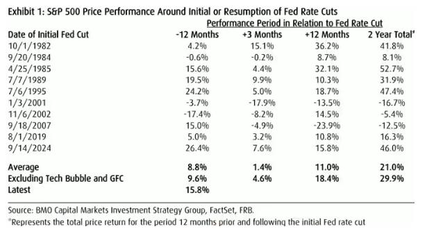 而从长期来看,历史表明,标普 500 指数在美联储首次或重启降息后的 12 至 24 个月内,大多都会出现正回报。下图是自 1982 年以来的历史回报情况: