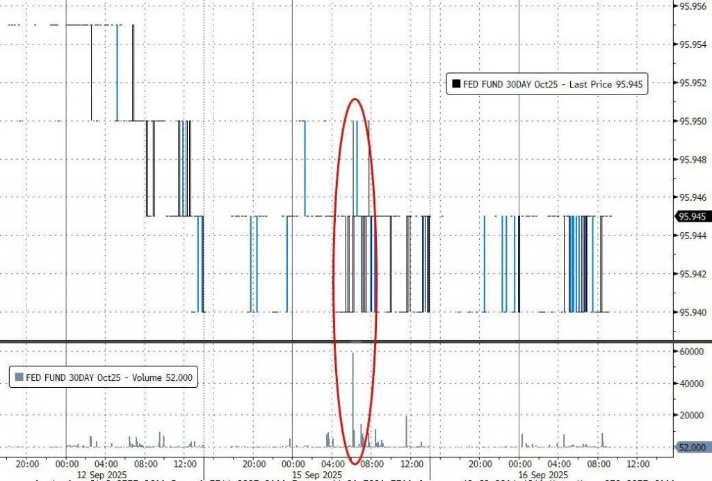 根据研究员 Ed Bolingbroke 的发现,周一曲线前端的资金流动,出现了有史以来最大的联邦基金期货大宗交易——该交易涉及 10 月的联邦基金期货合约,总计 84000 份,相当于每个基点变动的风险敞口高达 350 万美元。Bolingbroke 指出,该大宗交易的价格和时机均符合买方特征,鉴于当前掉期市场已充分消化 25 个基点降息预期,此举可能暗示该神秘交易员正对周三美联储决议直降 50 个基点的风险进行对冲。