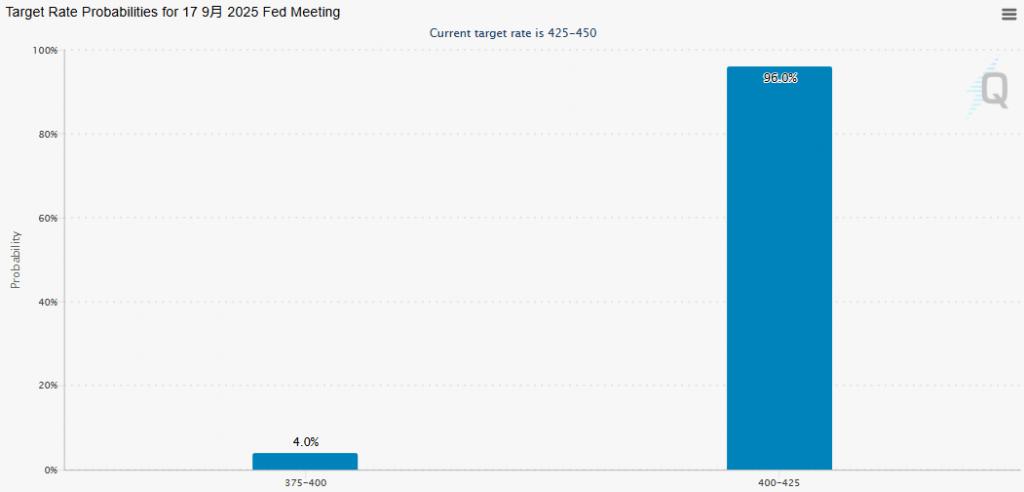 根据芝商所的美联储观察工具显示,美联储今晚降息 25 个基点的可能性约为 96.0%,降息 50 个基点的可能性为 4%。