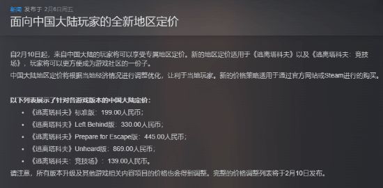 昨天《逃离塔科夫》Steam页面发布了一则公告,称将在2月10日启动对中国大陆地区玩家的专属定价,多个版本均大幅降价。